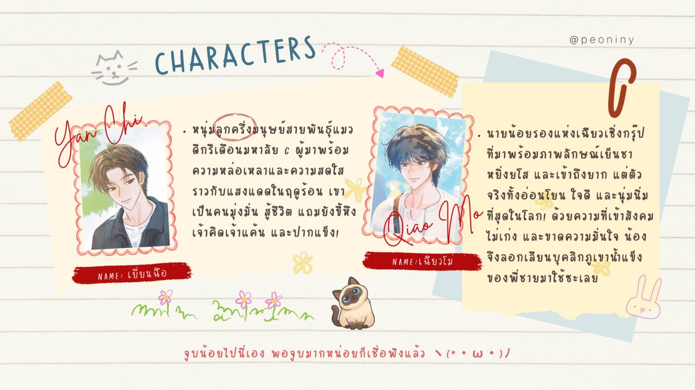 เยี่ยนฉือ ‒ หนุ่มลูกครึ่งมนุษย์สายพันธุ์แมว ดีกรีเดือนมหาลัย C ผู้มาพร้อมความหล่อเหลาและความสดใสราวกับแสงแดดในฤดูร้อน เขาเป็นคนมุ่งมั่น สู้ชีวิต แถมยังเจ้าคิดเจ้าแค้นและปากแข็งอีกด้วย! ส่วนภายใต้ความมีชีวิตชีวาของเยี่ยนฉือนั้นกลับซ่อนบาดแผลจากการถูกทอดทิ้งไว้เพียงลำพัง